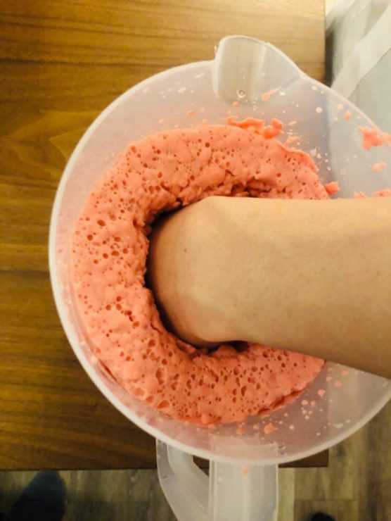 聽起來好像很簡單,實際上向理來試了好幾次,成功率卻很低。因為每次的水溫跟粉末的濃稠度都會影響到是否可以完美成形,再把手抽出來的時候,一個不小心便會破壞模型。而每次失敗之後就必須洗手,再把手浸到另一個容器裡嘗試另一次塑型。