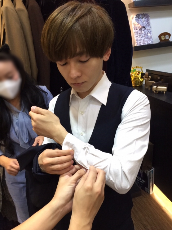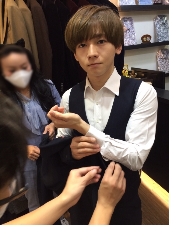 這次訂做了兩套西裝,一套是偏可愛風格的學生西裝,另一套則是走帥氣風格。而西裝的材質、樣式都是由向理來本人親自一一挑選。可能是店家給的選擇性太多,讓他一瞬間選擇困難症上身,挑選的時間久到主辦單位一度後悔帶他來這間店(笑)。