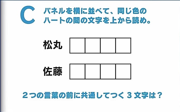 將卡片相鄰並排,由上往下唸出同色愛心之間的文字。下方畫有松丸四個空格跟佐藤四個空格。最下方寫著「兩個詞彙前面共通可以冠上的3 個字是?」
