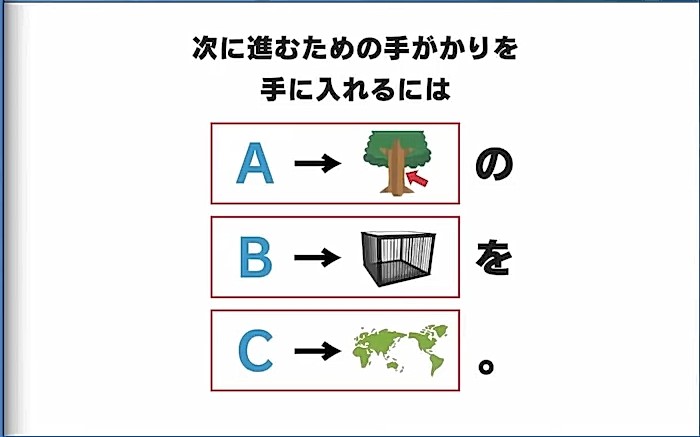分別填入上面解出的A=テキ、B=あさり、C=はかい之後,將指示書上的箭頭看做要轉換文字的意思,就會得到テキ變成みき(樹幹)、あさり變成おり(牢籠)、はかい變成せかい(世界)。