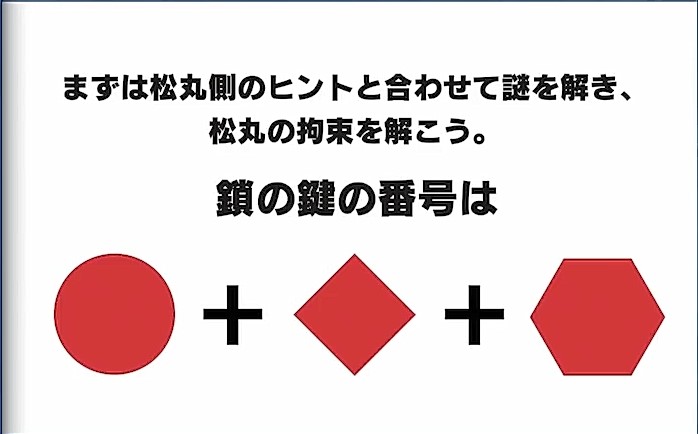 配合松丸亮吾所給的提示來解謎,就可以解開腳上的鐐銬。下方畫了「圓形+菱形+六角形」的圖示。