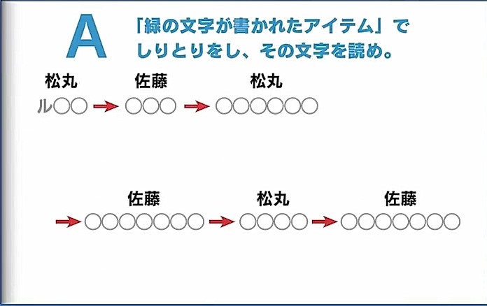 題目是「利用寫著綠色文字的道具」來進行文字接龍。下方寫的從松丸的「ル〇〇」⇒佐藤「〇〇〇」⇒松丸「〇〇〇〇〇〇」⇒佐藤「〇〇〇〇〇〇〇」⇒松丸「〇〇〇〇」⇒佐藤「〇〇〇〇〇〇〇」。