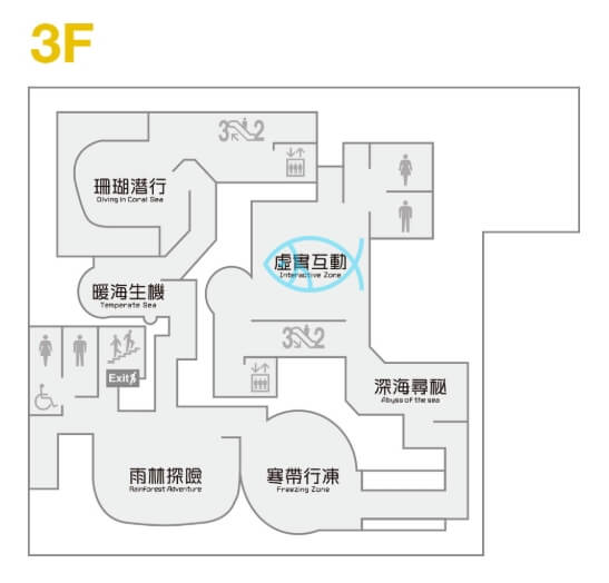 歷經數千萬年的堆積,時間造就珊瑚礁各式各樣的樣貌,與湛藍的海水形成強烈的對比。此展區為180度環景設計,大自然巧奪天工的設計盡享眼前。