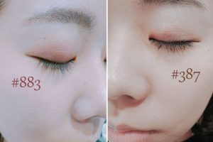 左右臉各擦了不同的顏色。左邊是PK883,右邊是BE387。兩款都很顯色,都只用單擦就創造出漸層的效果!小編自己平常比較常用咖啡色,但這次特別選了稍微帶點紅色的PK883。