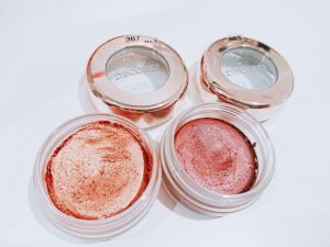 GD081是照片左邊那一款,正是所謂的金色眼影。可以擦出華麗感,適合作為打亮使用,或是搭配照片上的另一款藍色等其他顏色,妝容會更顯得華麗喔。