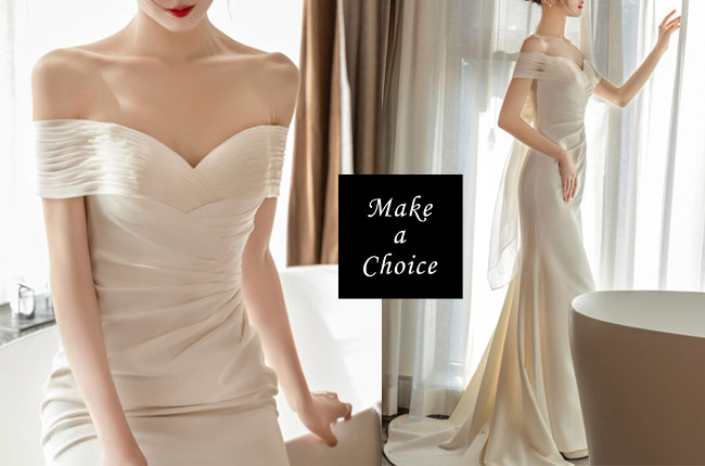 一字肩前露背軟緞帶後蝴蝶結飄帶魚尾小拖尾輕婚紗輕禮服,小露性感展現完美身材曲線 (NT$3,180)