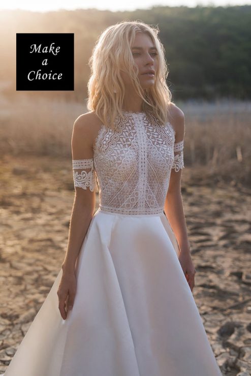 波西米亞唯美蕾絲露肩可拆式袖套緞面小拖尾輕婚紗輕禮服,上身蕾絲設計下擺俐落更顯得甜美又率性 (NT$4,380)