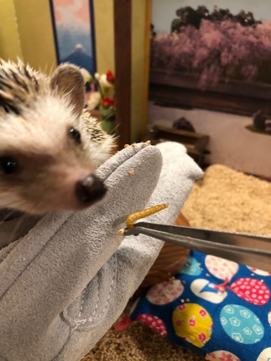 接下來試著給刺蝟吃點心,刺蝟最喜歡的好像就是麵包蟲。
