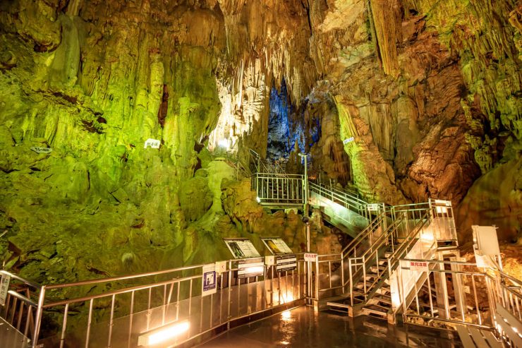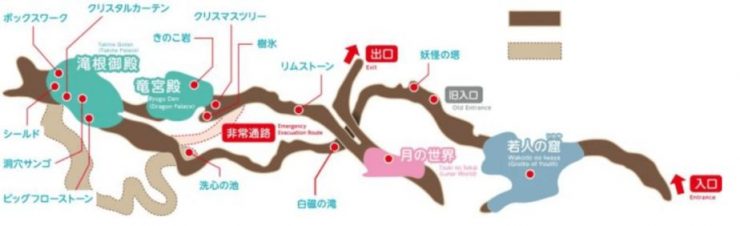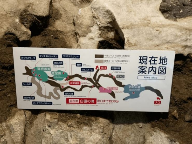 鍾乳洞內有許多獨特的地方。例如,“妖怪塔”就像是妖怪的臉。起初我們無法找到它,但仔細一看確實如此!還有一個被稱為“滝根御殿”的地方,這是一個高29米的巨大空間,有著高低不一的大型鍾乳石柱,仿佛是一座神殿。在照明的照射下,這裡顯得有些神秘。您可以在這裡拍攝許多美麗的照片,在休息一下後繼續前進。
