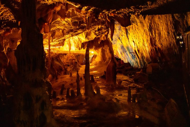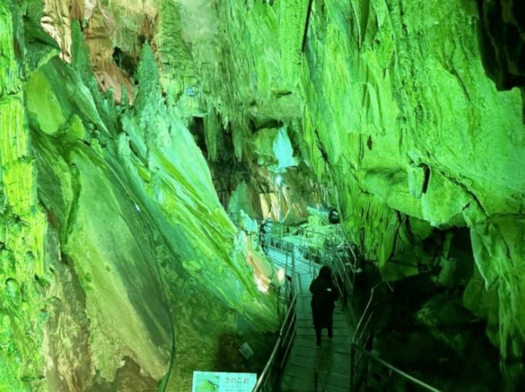 一進入入口,就能看到曲折的道路。地板看起來是潮濕的,但不用擔心會弄濕衣服,這些都是從鍾乳洞的壁面滲出的水。在鍾乳洞內,您可以感受到比外面更濕潤的空氣。