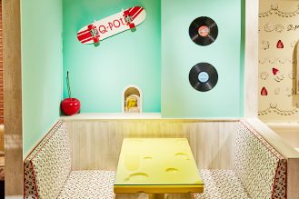 明亮的湖水綠牆面配上可愛的起司桌,好像整個空間都香香的!