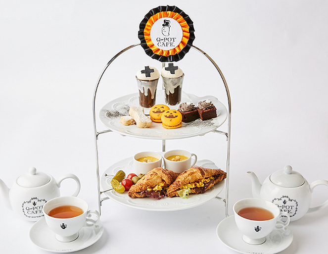 把一向優雅的下午茶套餐加上萬聖節的鬼怪們會變成什麼樣子呢?上層盤子上有巧克力慕斯(舊式十字架的那兩杯!)、骨頭形狀的餅乾、南瓜馬卡龍、巧克力加覆盆子的蛋糕還有汽水口味的藥劑。下層盤子則是培根洋菇蛋三明治、南瓜玉米湯,以及西班牙式竹籤小吃!是不是超豐盛!