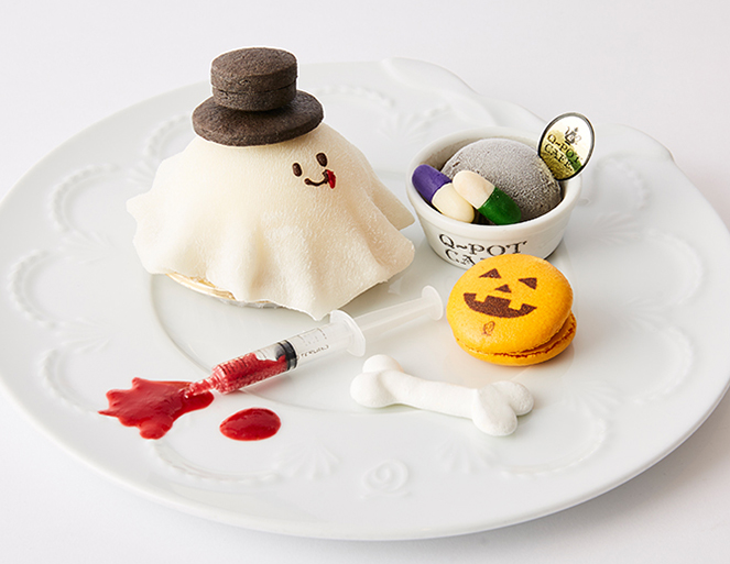 披著白麻糬皮的可愛幽靈還戴著一頂帽子,盤子上看起來嚇人的血其實是用覆盆子做的,而旁邊的膠囊也是用巧克力製成,還請放心享用!