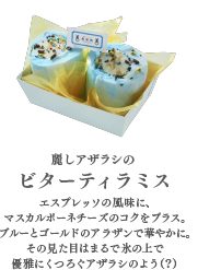 「美麗的海豹」是咖啡提拉米蘇口味,內餡是義式濃縮咖啡加上瑪士卡彭乳酪。外觀則是象徵冰與海豹的藍色與金色,用看的就能感受到海豹在冰上優雅地玩耍吧!